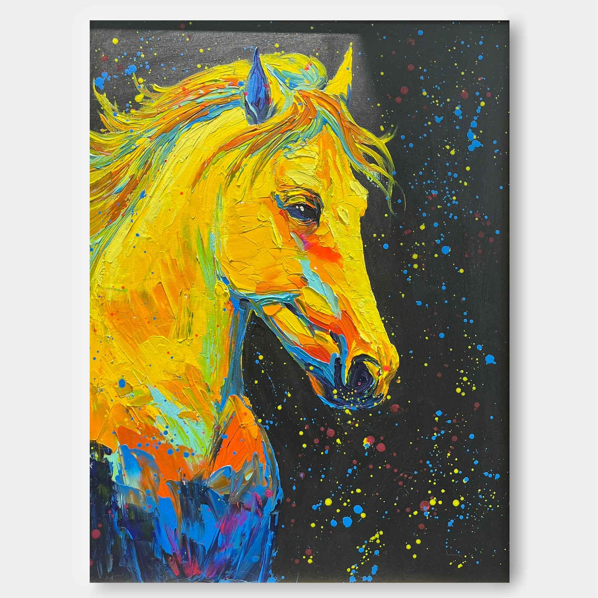 Electrify your space with this incredible piece of graffiti wall art. This painting features a majestic horse, rendered in a brilliant, sunny yellow, set against a dramatic black background with vibrant paint splatters. The artist's use of thick, impasto strokes gives the piece a dynamic, textured quality. As a stunning example of pop art wall art, this horse painting on canvas combines classic portraiture with a modern, urban edge. It's a powerful statement of color and energy, perfect for anyone looking to add a bold and contemporary focal point to their decor.