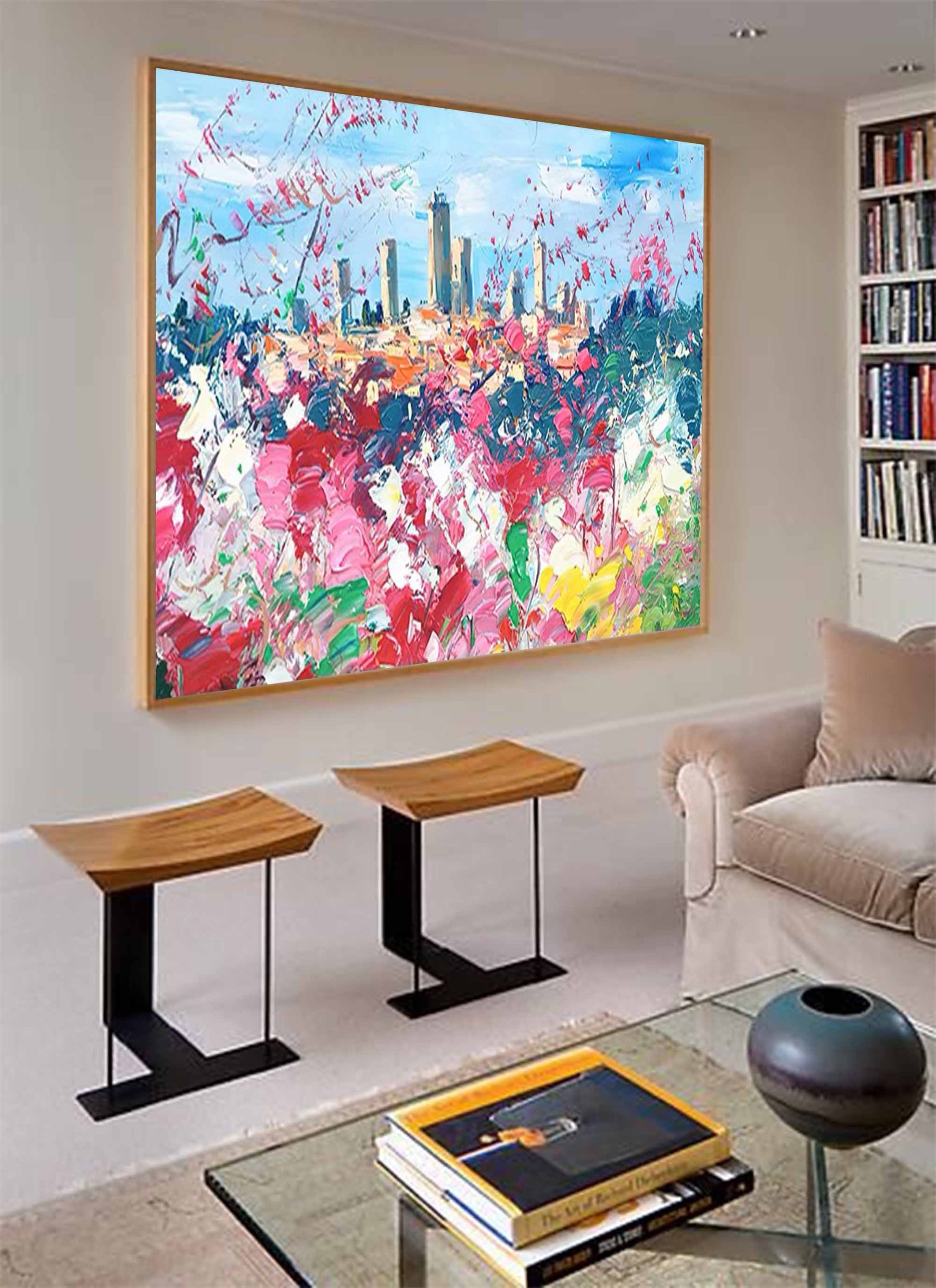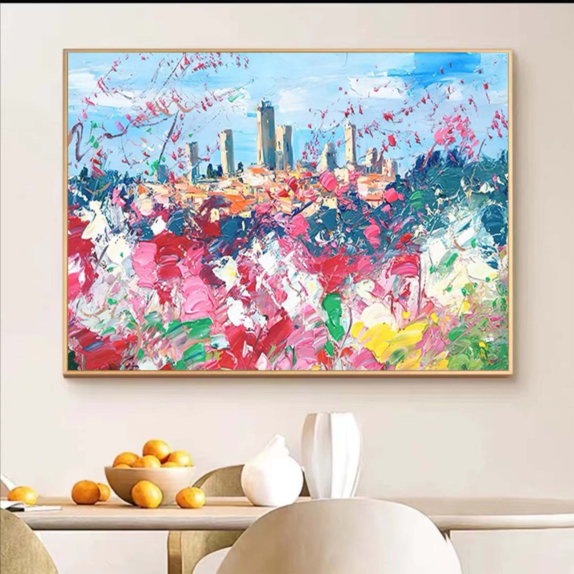 Capture the joy of a sunny day with this vibrant **abstract flower painting**. Featuring a lively field of wildflowers in pink, red, and yellow set against a distant city skyline, this handmade canvas blends the beauty of nature with urban charm. The loose, impressionistic brushstrokes create a sense of movement and energy, making it a perfect piece of **colorful wall art** for a bright living room or dining area. As a stunning example of **abstract landscape painting**, it brings a fresh, romantic atmosphere to any space, celebrating color and light.