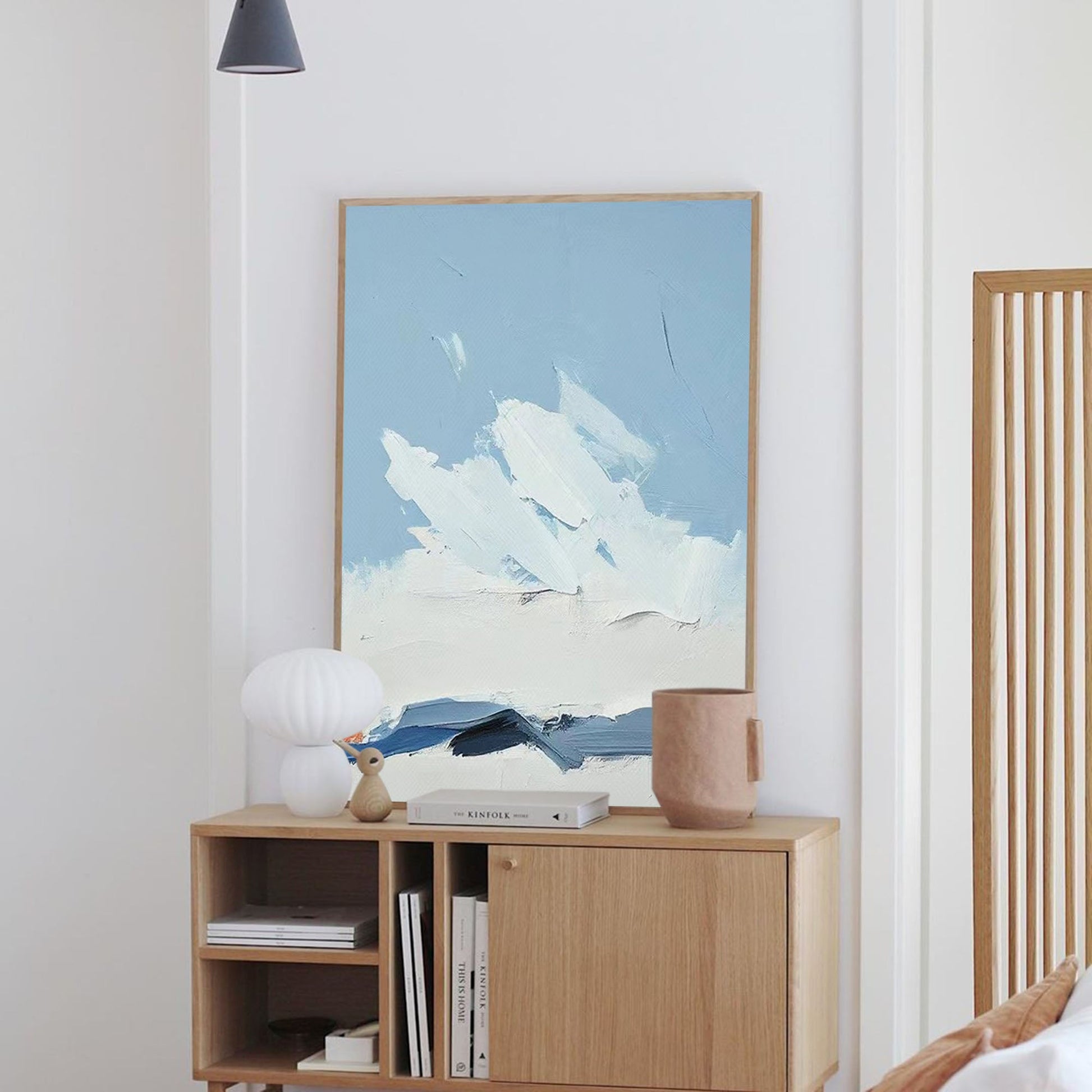Bring the crisp, serene beauty of the alps into your home with this stunning **mountain wall art**. This hand-painted canvas captures the essence of a snow-covered peak with thick, gestural strokes of white and deep blue. The artist's minimalist approach creates a powerful piece of **minimalist landscape art** that feels both modern and timeless. A single, surprising pop of orange adds a touch of warmth to the cool palette. As a beautiful example of **blue and white wall art**, this **textured wall art** adds a sense of calm and sophistication to any room.