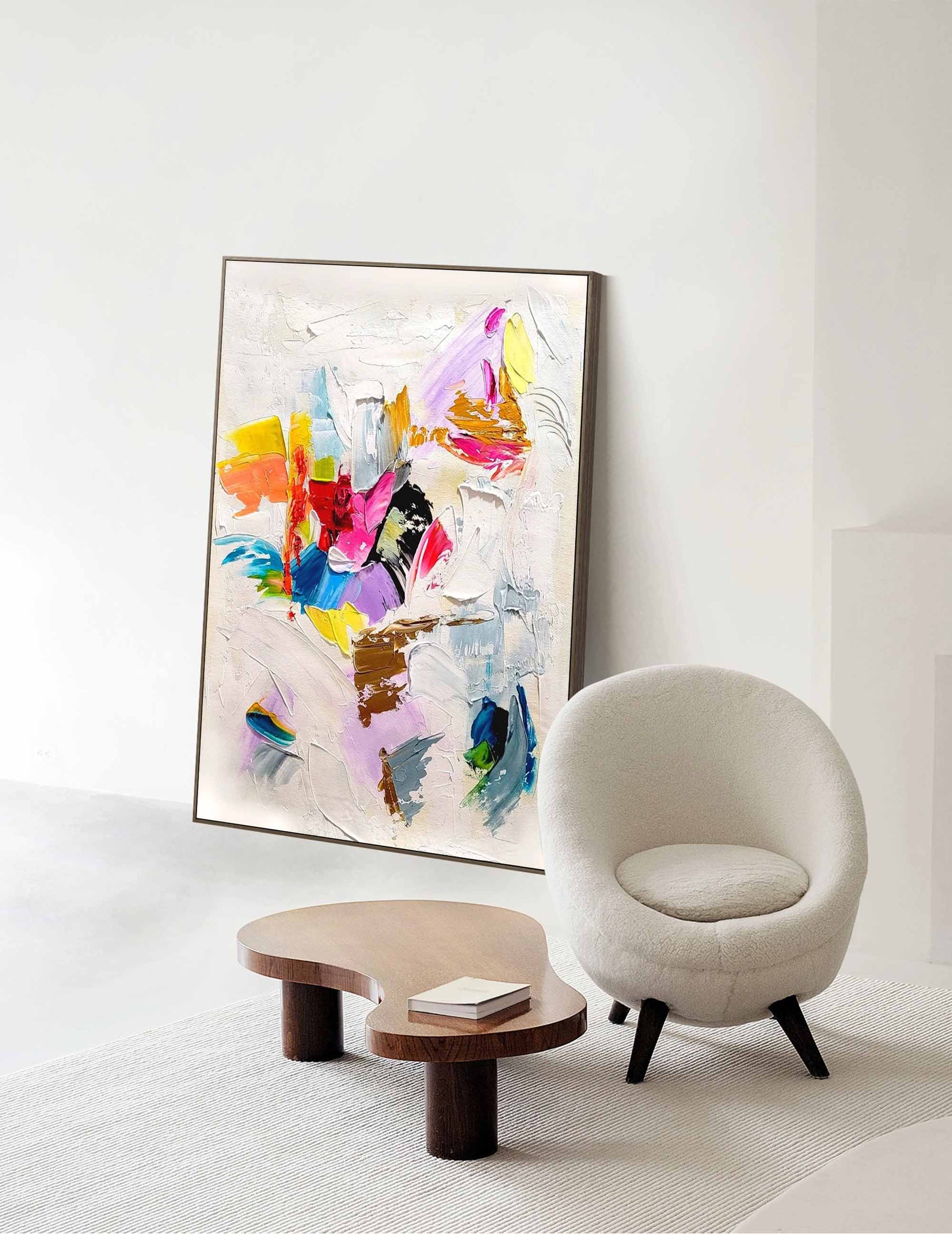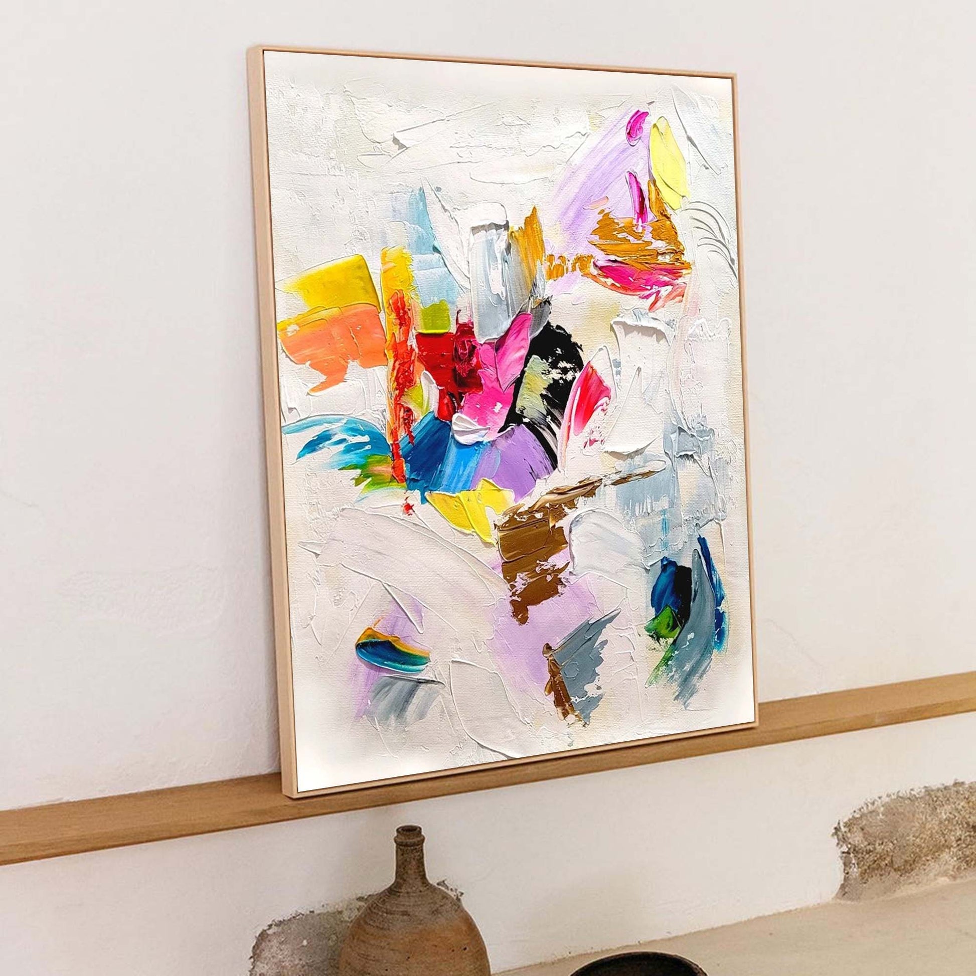 Ignite your space with the dynamic energy of this **canvas wall art abstract** piece. Featuring a whirlwind of thick, impasto strokes in hot pink, bright yellow, deep blue, and gold, this handmade painting is a celebration of color and texture. The vibrant hues explode against a sculpted white background, creating a stunning depth and movement. As a unique piece of **textured abstract art**, it adds a modern, expressive touch to any room. This **colorful wall art** is perfect for those who want to add a bold, artistic statement to their home decor.