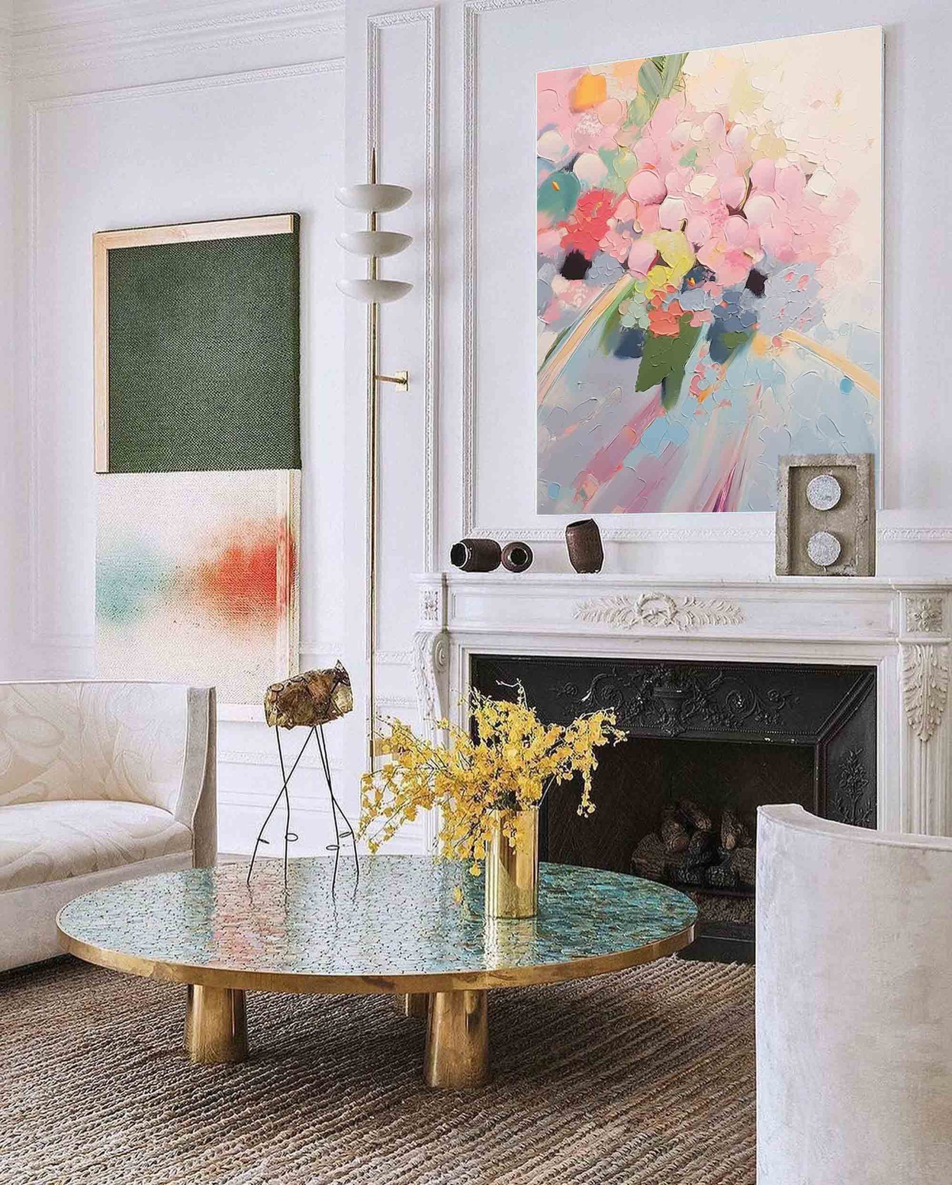 Bring a touch of springtime joy into your home with this whimsical hydrangea wall art. This heavily textured piece features an explosive bouquet of abstract hydrangeas, created with thick, sculptural dabs of paint in a dreamy, pastel colored wall art palette. The joyful mix of soft pinks, blues, and yellows makes this a perfect example of an impasto flower painting. It's a piece of truly whimsical wall art that adds a light, airy, and cheerful atmosphere to any contemporary space.