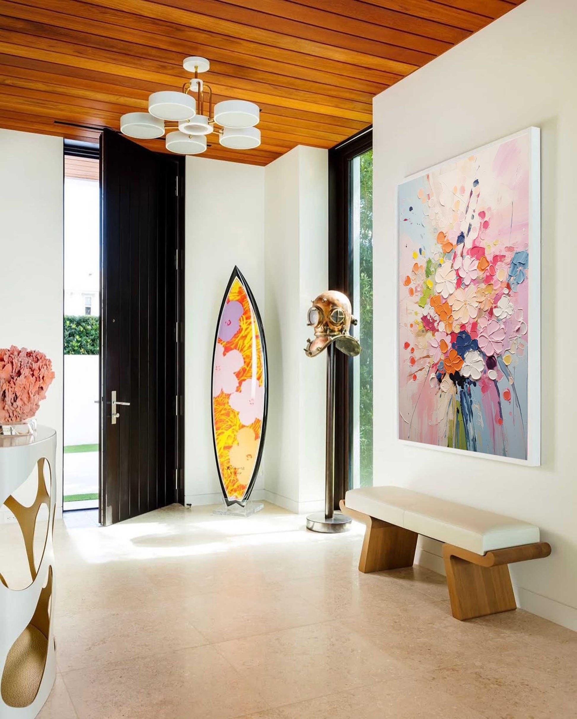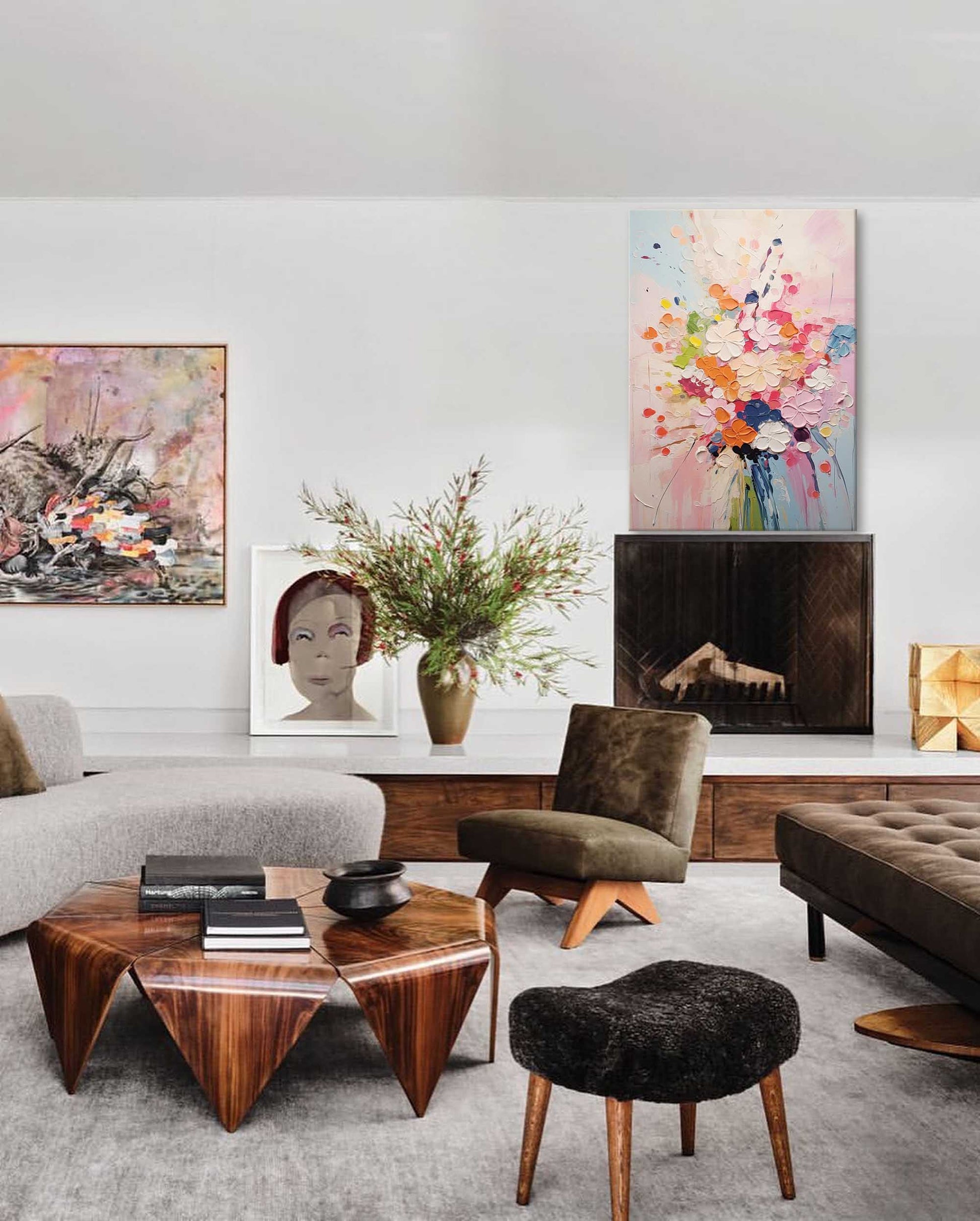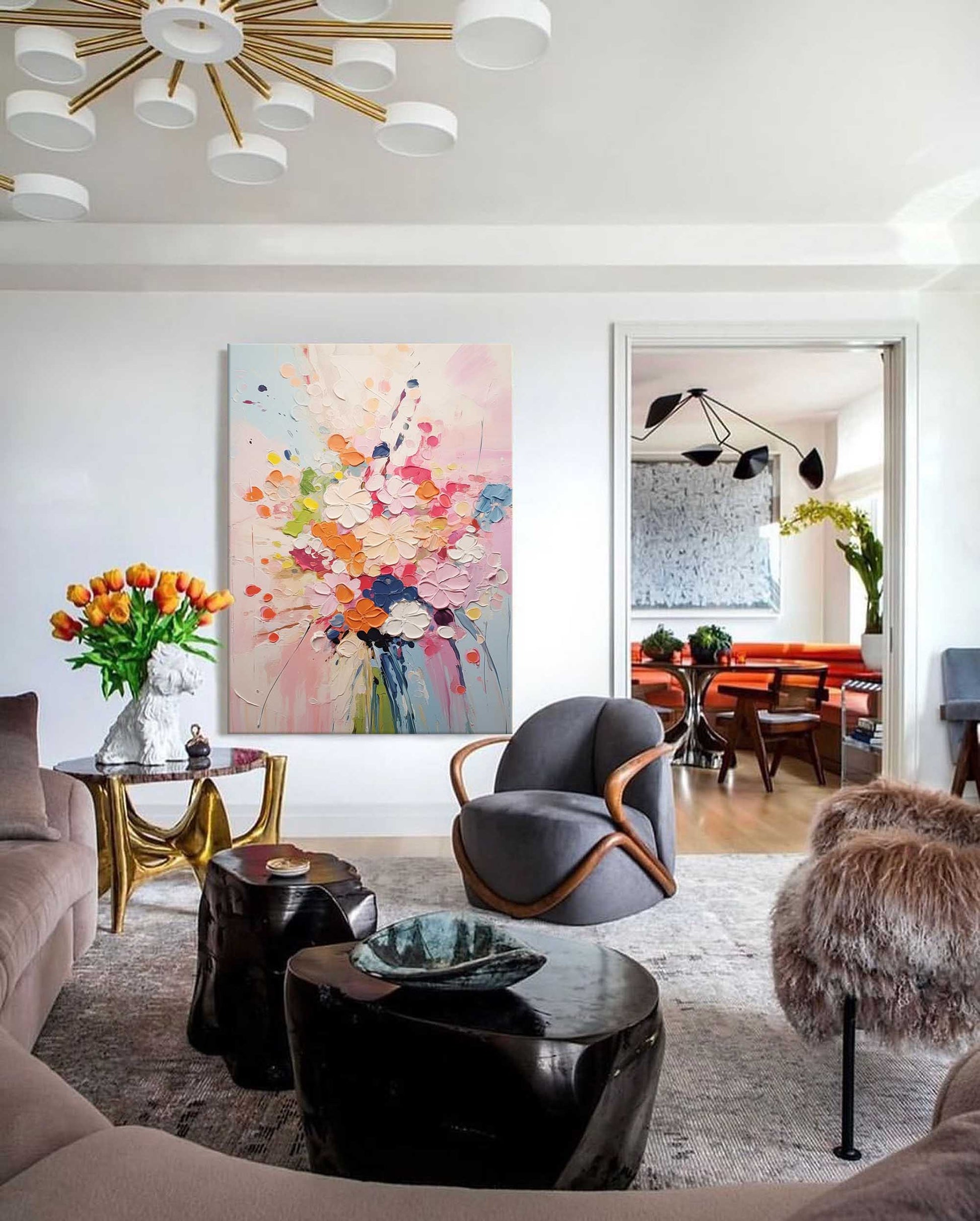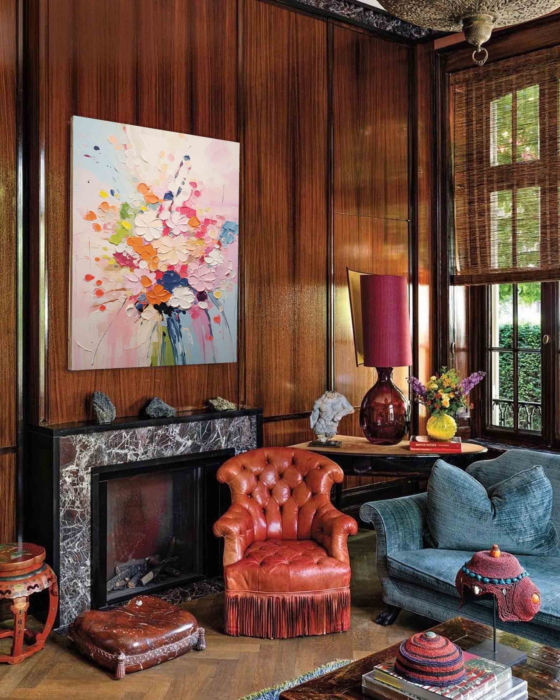 Celebrate the beauty of nature with this vibrant abstract floral art. This piece is an explosion of color and texture, featuring a joyful bouquet of flowers brought to life with a thick, sculptural impasto technique. As a perfect example of colorful flower paintings, the lively palette of pink, orange, red, and blue creates an energetic and happy atmosphere. This impasto flower painting is one of our most cheerful colorful artworks, guaranteed to bring a dynamic and uplifting feel to any room in your home.