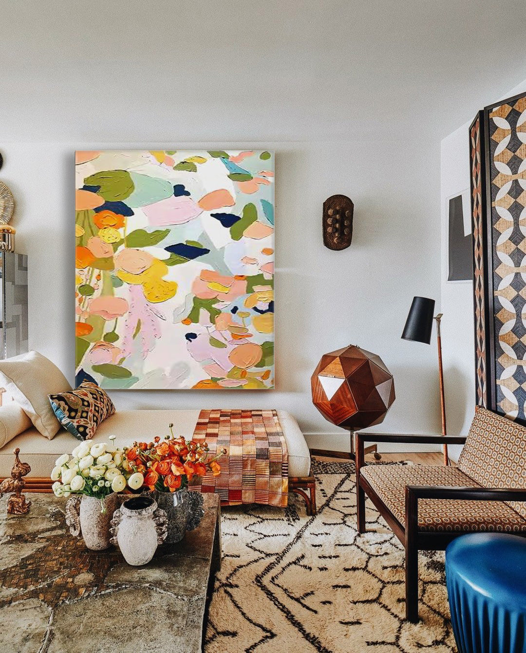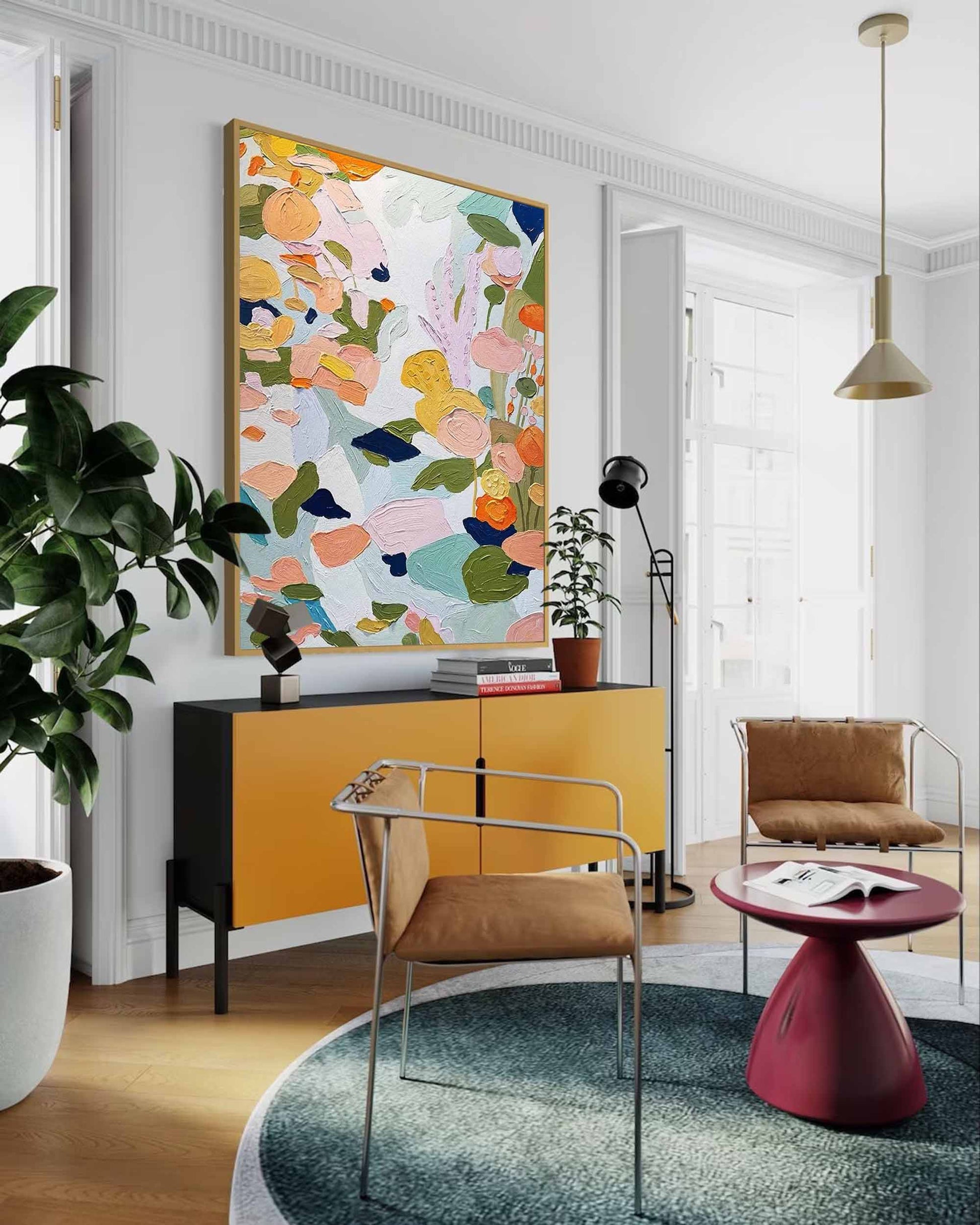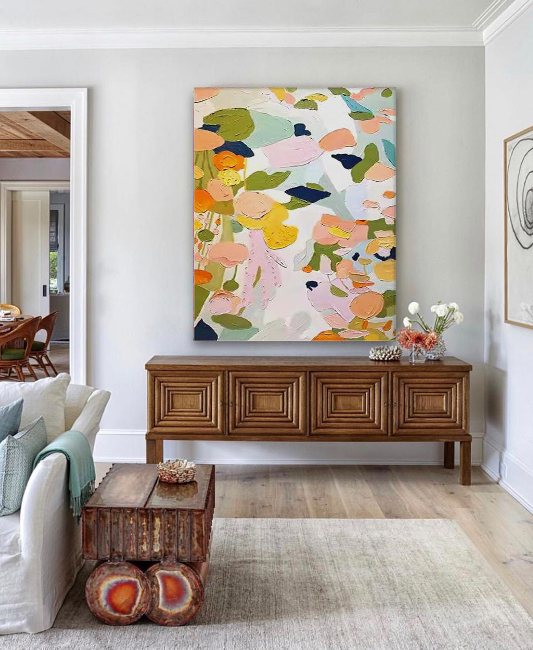 Bring the joyful chaos of a blooming garden into your home with this stunning botanical wall art. This piece is a vibrant celebration of color and texture, featuring a delightful arrangement of abstract flowers. As a wonderful example of abstract art paintings flowers, thick, impasto strokes of pink, orange, and yellow pop against a serene, cool-toned background. This textured oil paintings on canvas piece feels alive with energy. Perfect for any space needing a cheerful lift, these colorful flower paintings are a modern take on a classic subject.