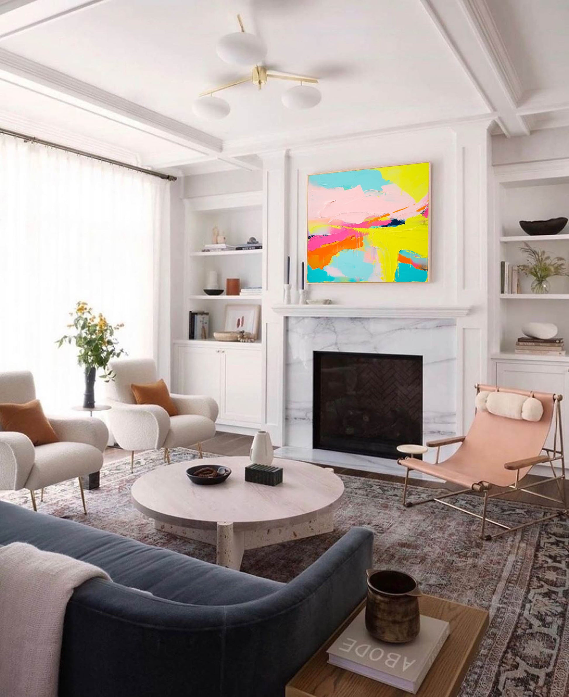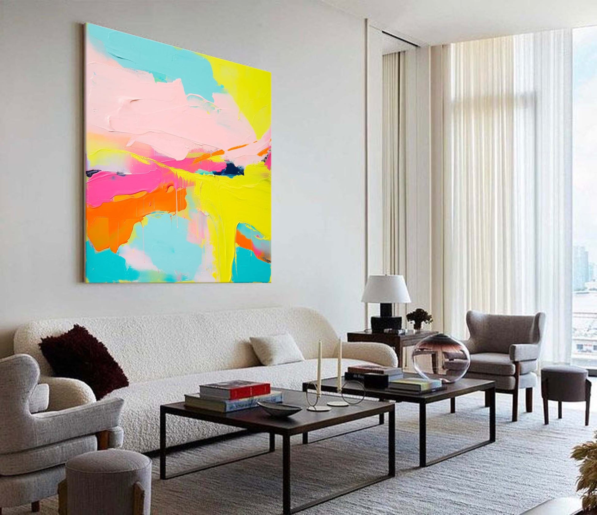 Infuse your space with pure joy with this exuberant abstract colorful painting. A stunning example of a happy abstract painting, this piece is alive with a vibrant, summery palette of neon yellow, hot pink, and turquoise. This is a masterful heavy texture painting, with thick, sculptural strokes of paint that create a dynamic, tactile surface. As one of our most bright colored paintings, it brings an unparalleled sense of energy and optimism, making it a perfect statement piece for any modern and lively interior.