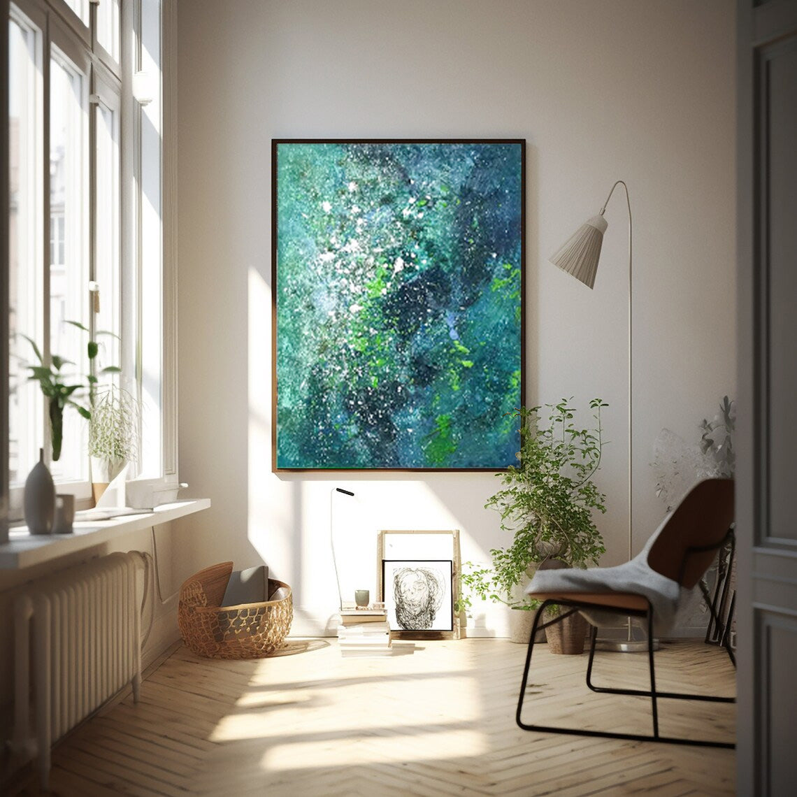 Plunge into a world of mystery and beauty with this captivating ocean abstract painting. A stunning example of dark abstract artwork, this piece features a deep, layered palette of teal, navy, and emerald green, reminiscent of the deep sea. A dynamic splash of white and vibrant green creates a focal point like bioluminescence in the dark. As a premier work of textured art, its rich, tactile surface invites contemplation. This powerful piece of blue abstract art will add a sophisticated and organic focal point to any modern space.