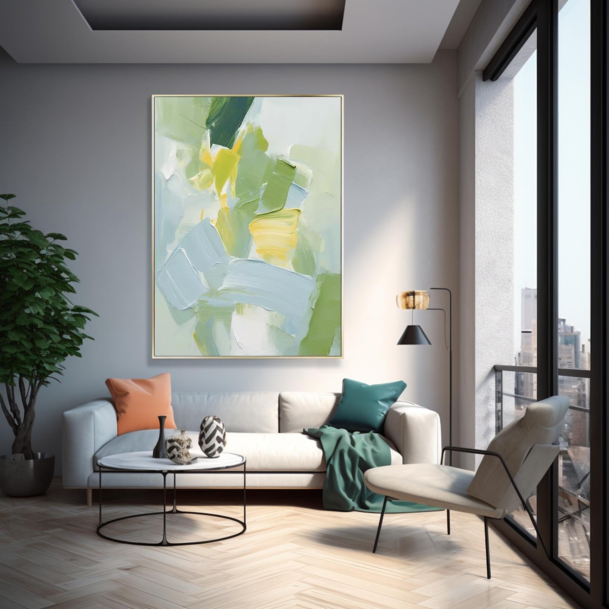 Bring the freshness of a spring day indoors with this stunning green abstract painting. This hand-painted canvas is a joyful exploration of color and texture, featuring energetic, thick brushstrokes. As a beautiful example of green and yellow paintings, it blends sage and chartreuse with soft blues and whites. This piece of artwork green uses a heavy impasto painting abstract technique, giving it a dynamic, tactile quality that feels both serene and uplifting, perfect for any contemporary space.