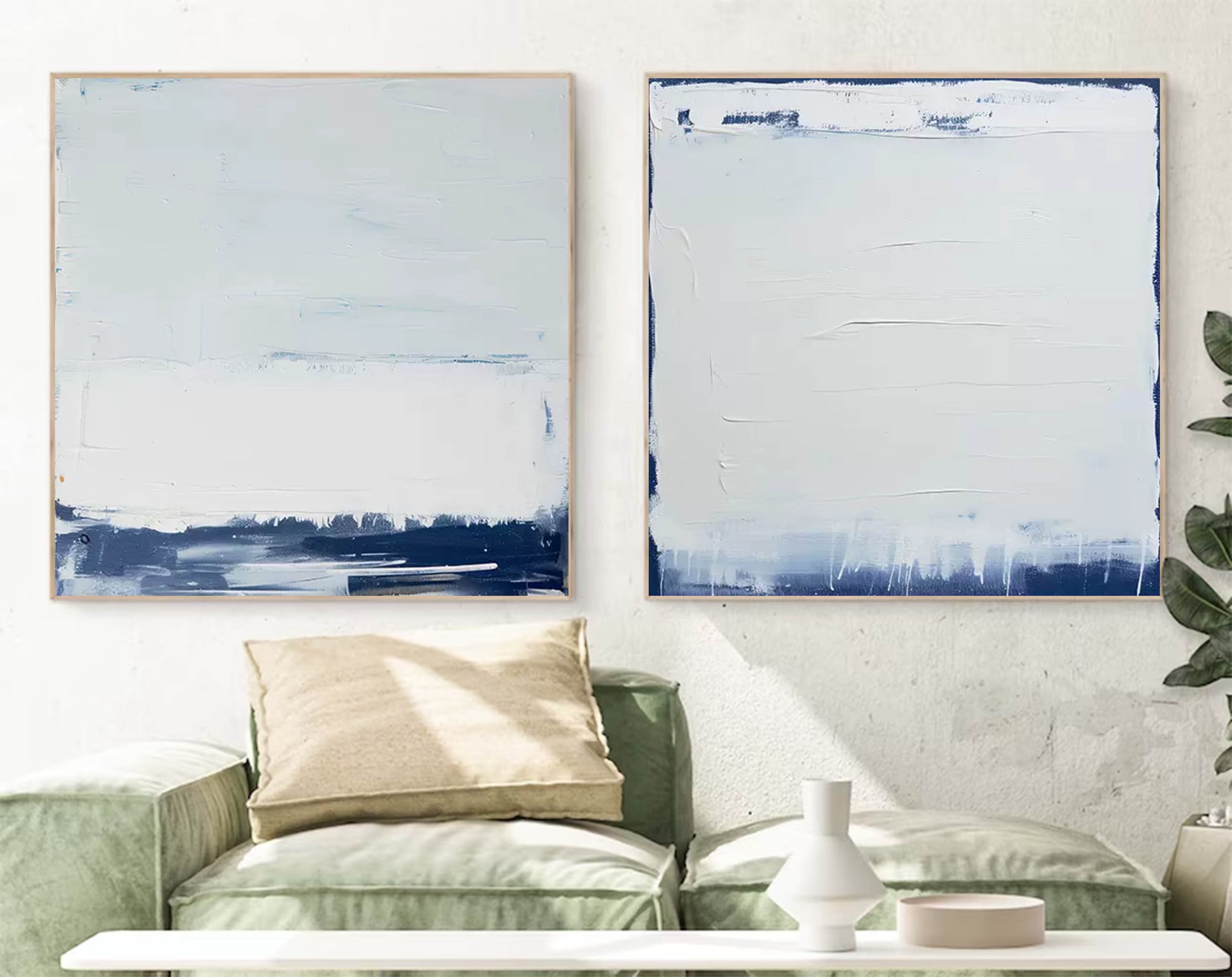 Experience the serene power of the coast with this stunning set of white on white abstract paintings. This hand-painted diptych art features two panels that explore the dynamic contrast between calm and storm. As a masterful example of abstract seascape paintings, the heavily textured navy blue base grounds the composition, while the thick, impasto white creates a sense of light and space. This is a perfect example of a minimalist painting in black and white (using blue) that brings a dramatic yet peaceful presence to any modern interior.
