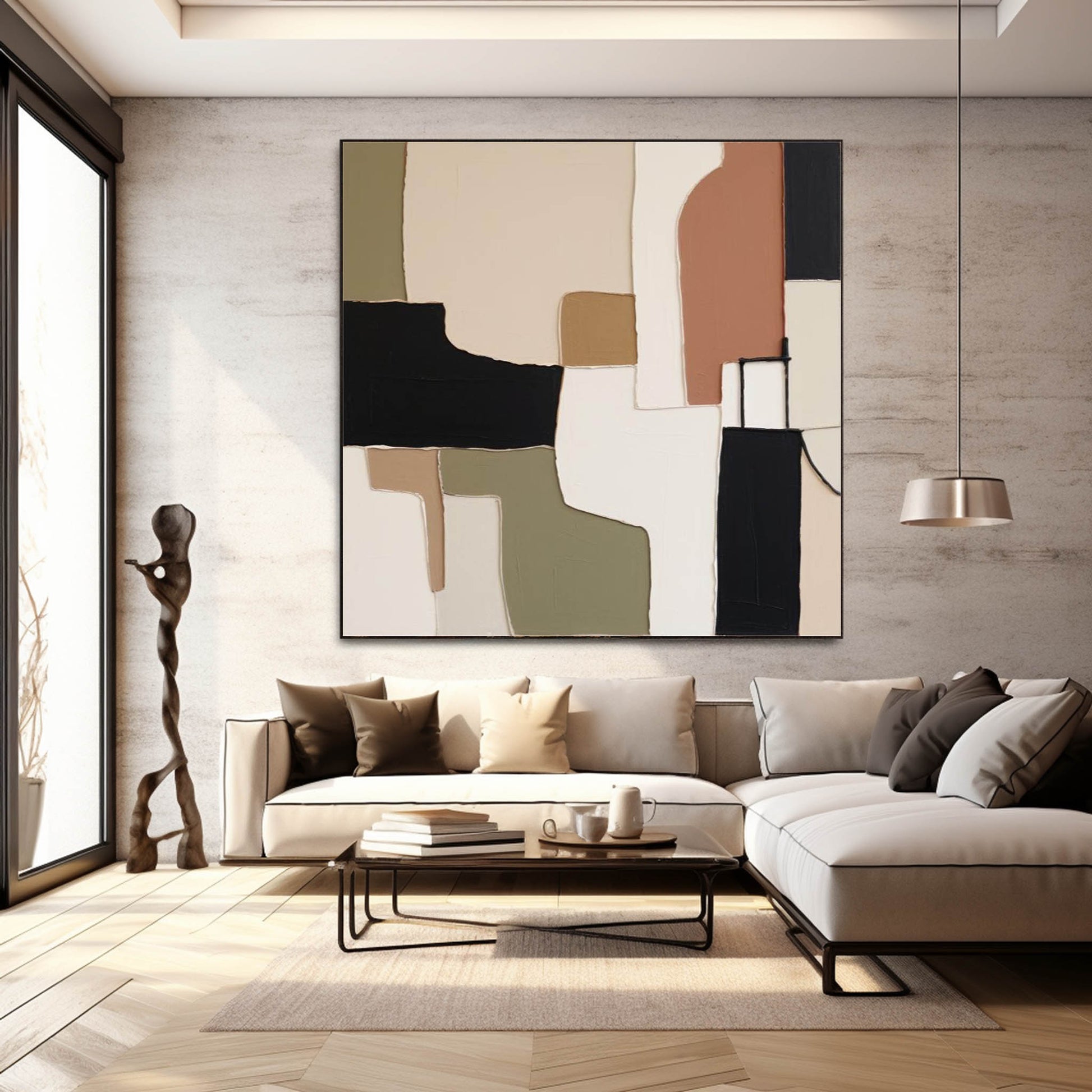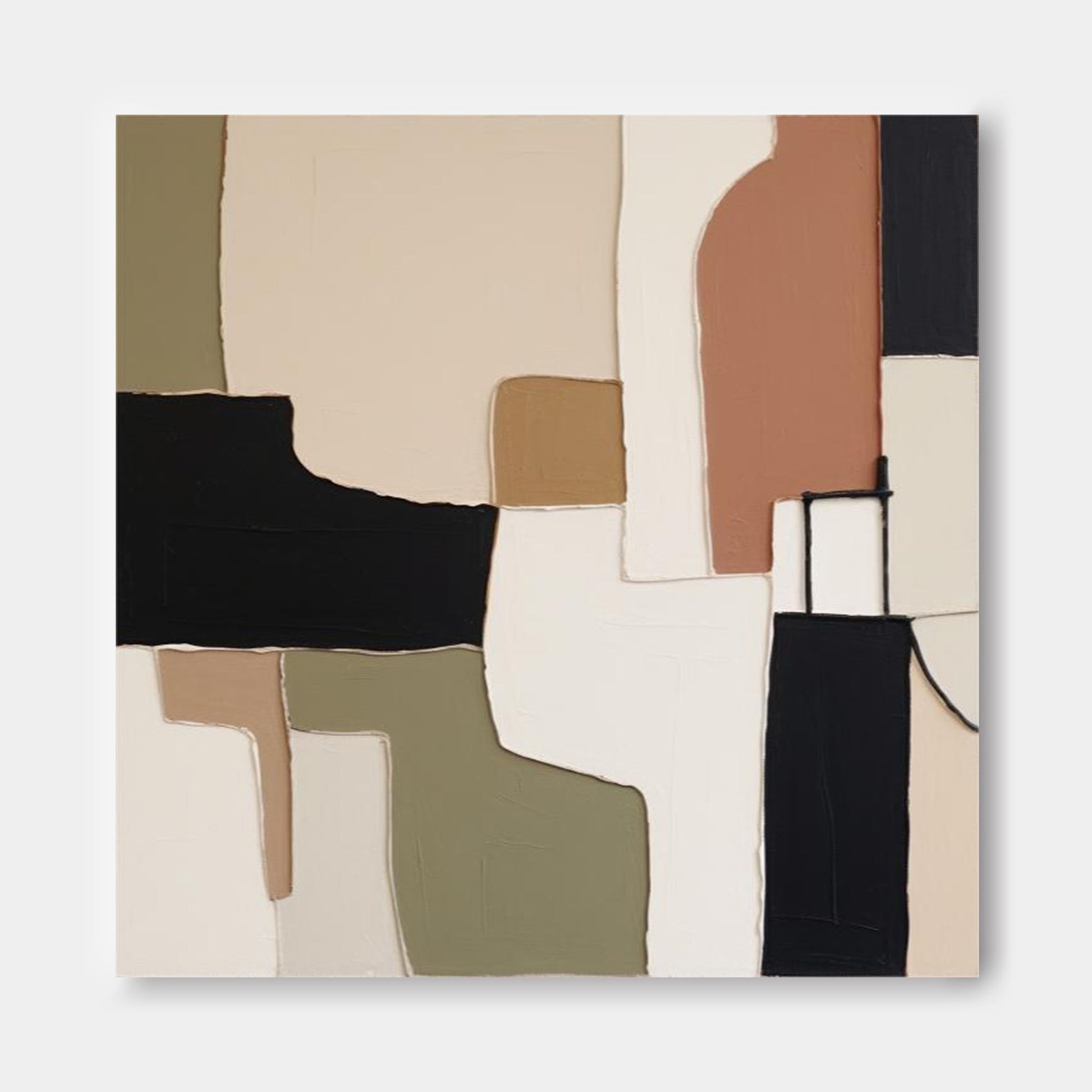 Anchor your interior with this powerful black modern artwork, a sophisticated composition of interlocking, textured forms. This hand-painted canvas is a masterful example of modern minimal art, featuring a grounded palette of rich natural hues. As a premier piece of earthy tones artwork, it combines bold black, warm terracotta, and serene sage green to create a balanced, architectural presence. The striking contrast makes it exceptional black and brown art, offering a tactile and visually engaging experience for any contemporary space.