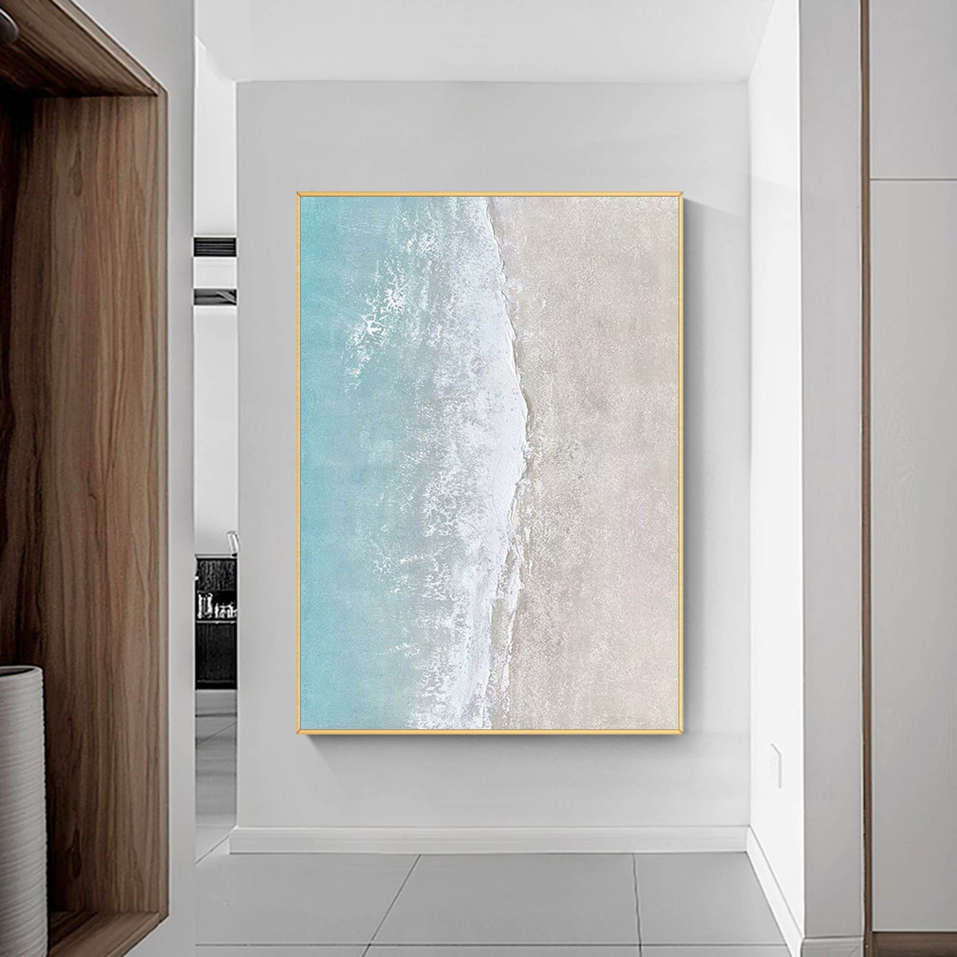 Bring the tranquility of the coast into your home with this serene **beach wall art**. Capturing an aerial view of the shoreline, this handmade painting features a soothing gradient of turquoise water meeting soft, sandy beige. The crashing waves are rendered in thick, impasto texture, creating a realistic, frothy sea foam effect that adds depth and dimension. Perfect for a coastal-themed bedroom, bathroom, or living area, this **modern coastal wall art** offers a minimalist yet tactile interpretation of the sea. It serves as a calming piece of **textured wall art** that instantly relaxes the mind.