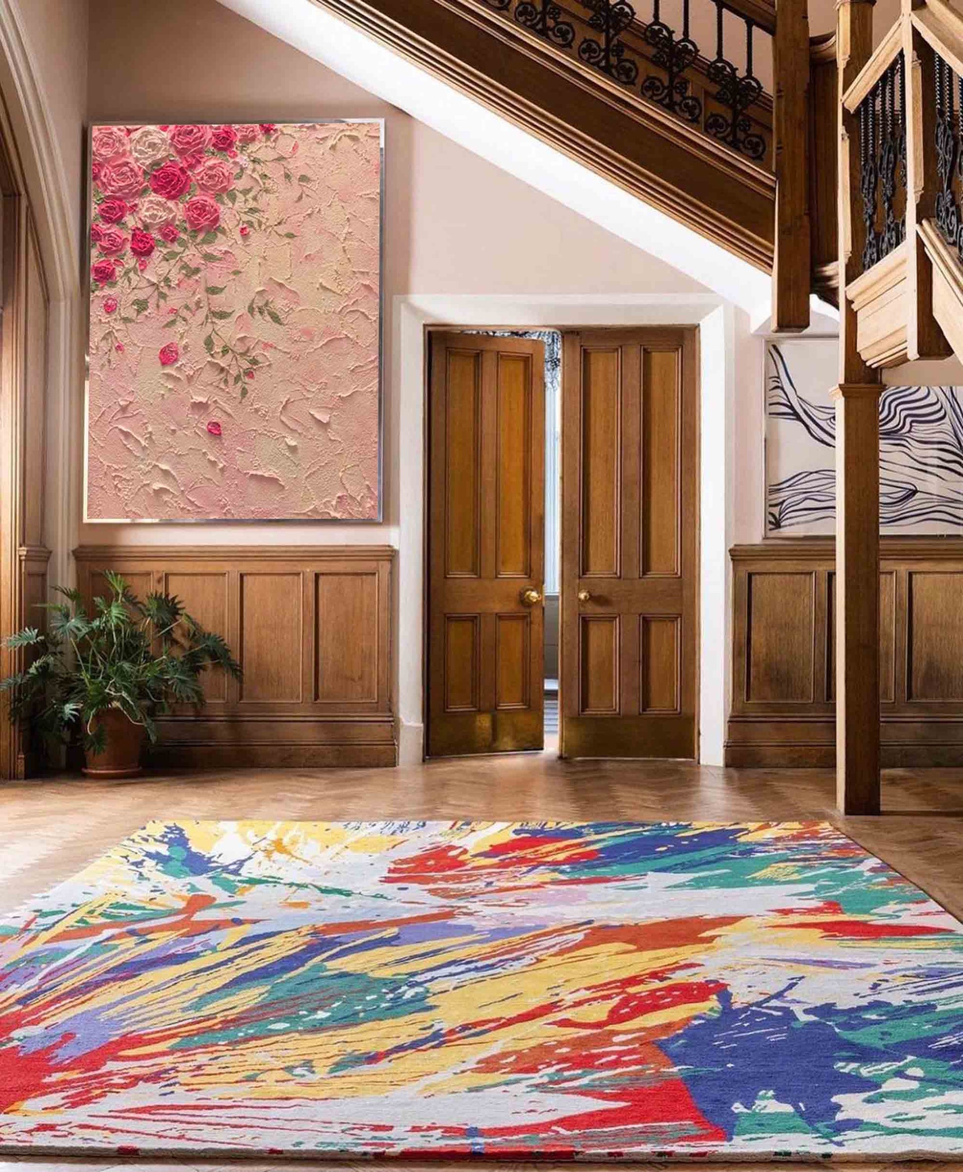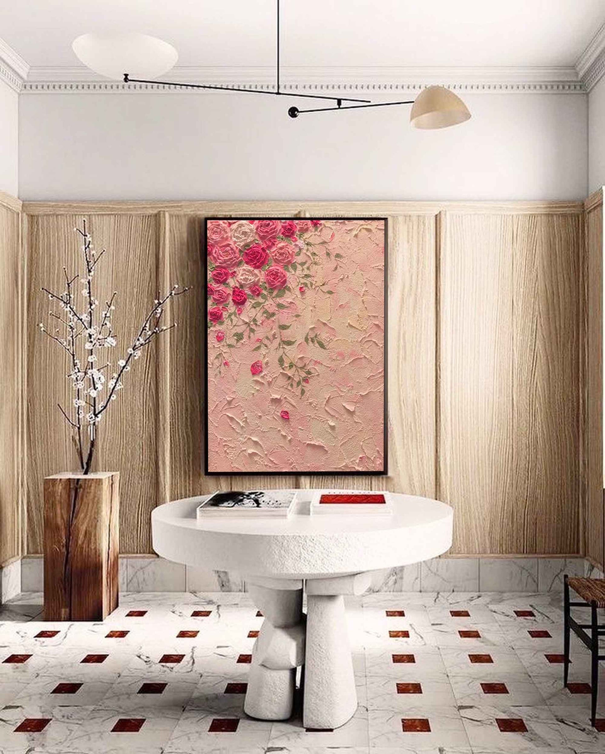 Embrace timeless elegance with this exquisite piece of romantic wall art. This painting features a cascade of beautifully sculpted pink and white roses, each petal crafted with thick, impasto paint that creates a stunning 3D effect. The flowers tumble down a heavily textured, blush-pink background reminiscent of a vintage European wall. Perfect as rose wall art for a bedroom or living area, this textured floral painting embodies a sophisticated shabby chic wall art aesthetic, adding a touch of classic charm and tactile beauty to your home.