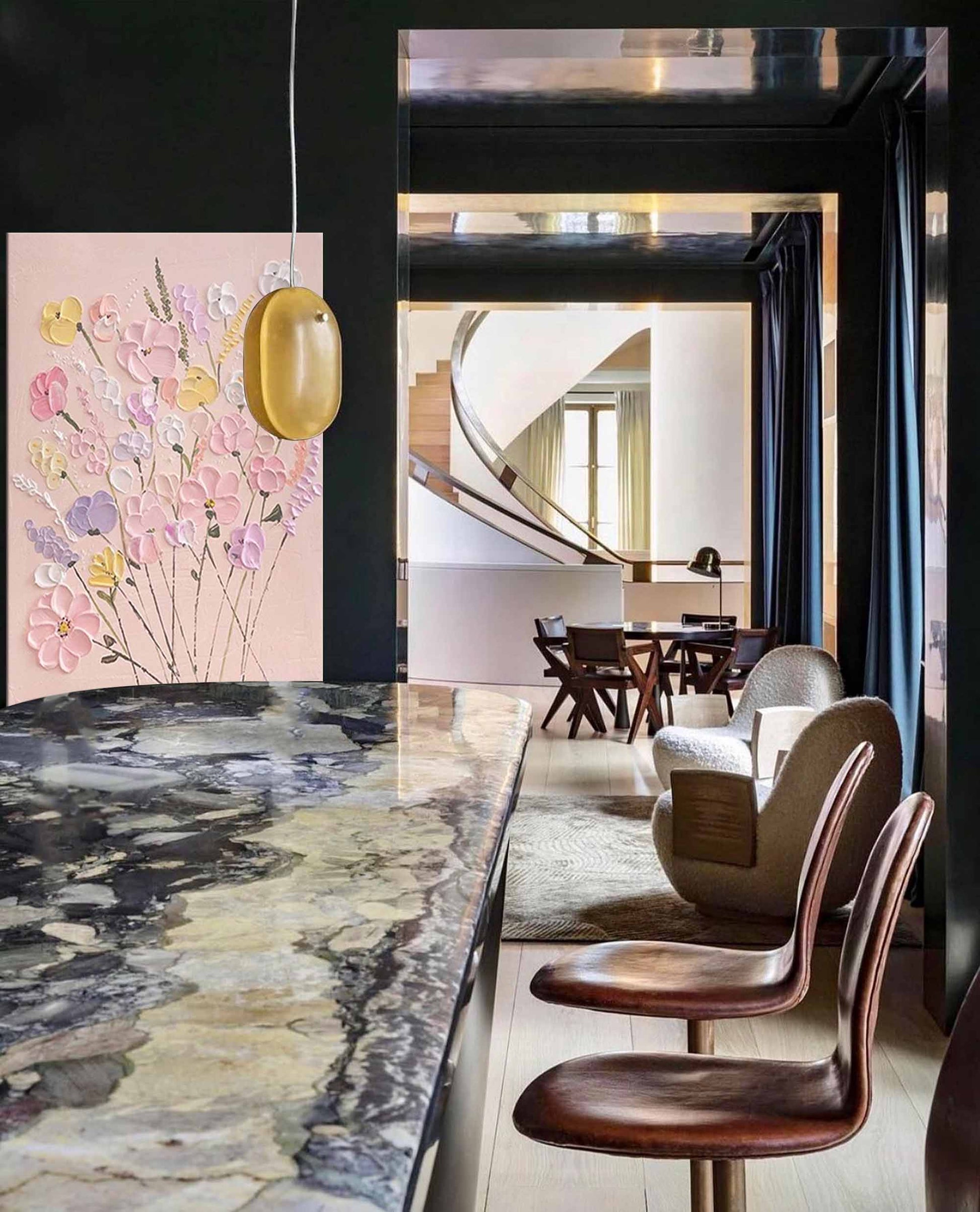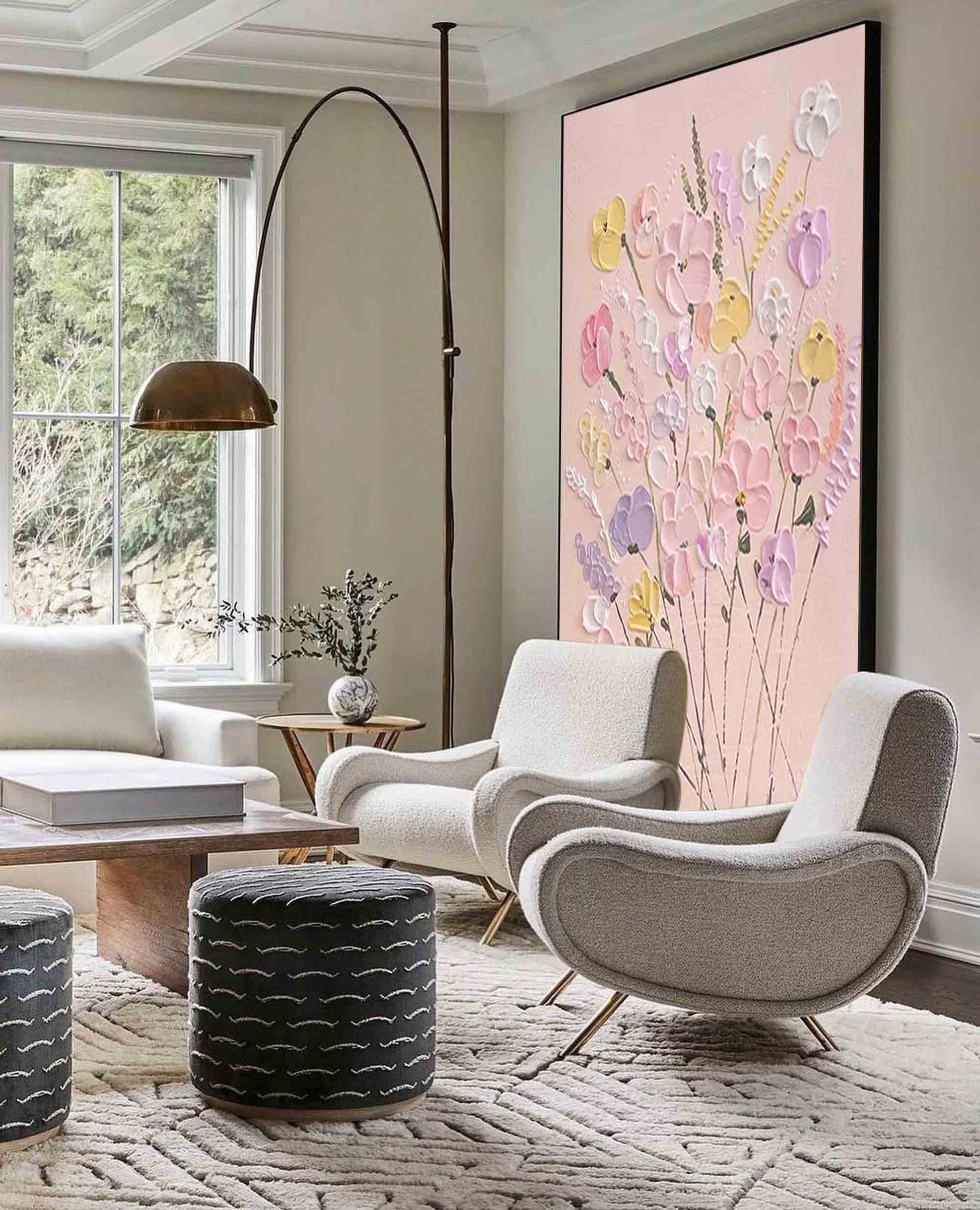 Bring the delicate charm of a spring meadow into your home with this exquisite pink floral wall art. This unique piece features beautifully sculpted flowers created with thick, impasto paint, giving it a stunning 3D flower wall art effect that you can see and feel. Each petal in this textured floral painting is a small sculpture. The soft pastel palette of pinks, lavenders, and yellows against a blush background makes this floral canvas wall art a tranquil and heartwarming addition to any room, perfect for a nursery or bedroom.