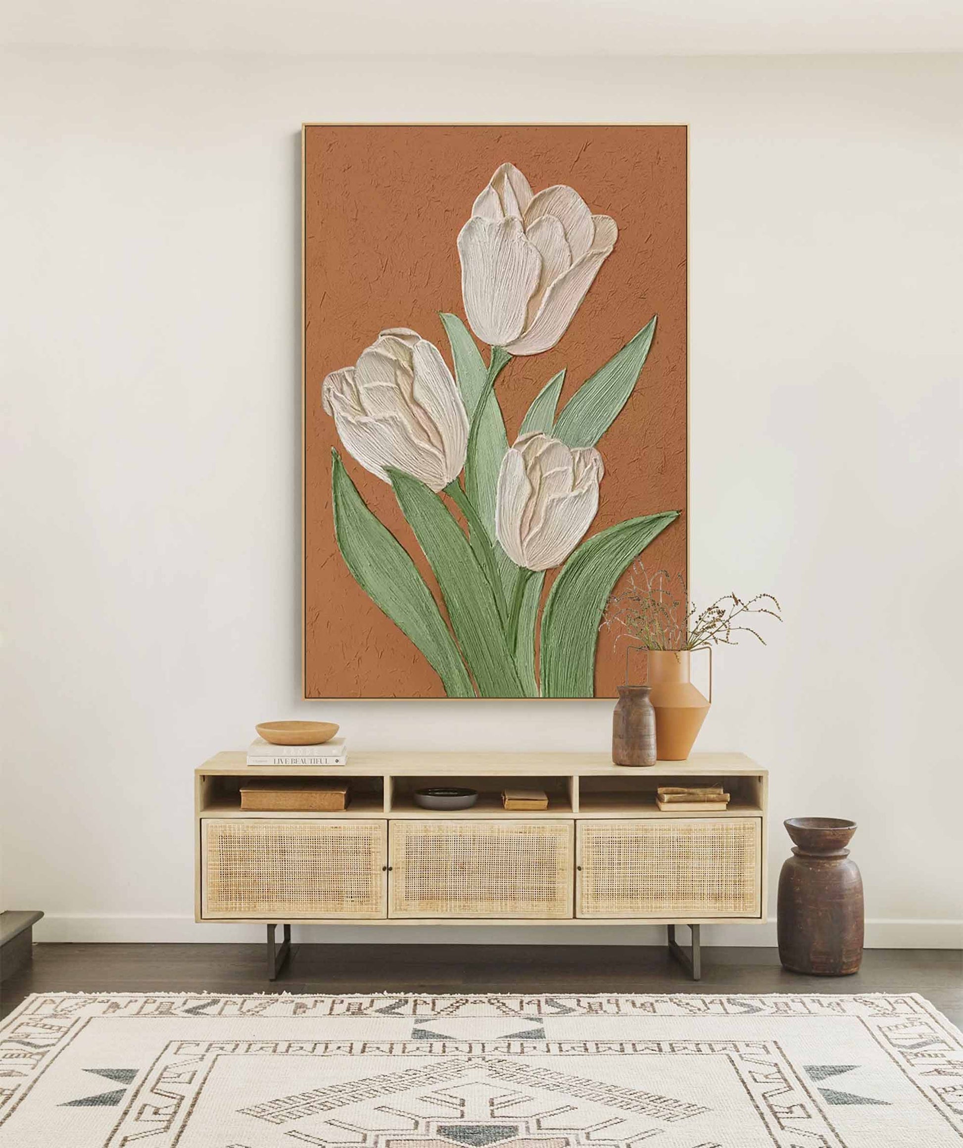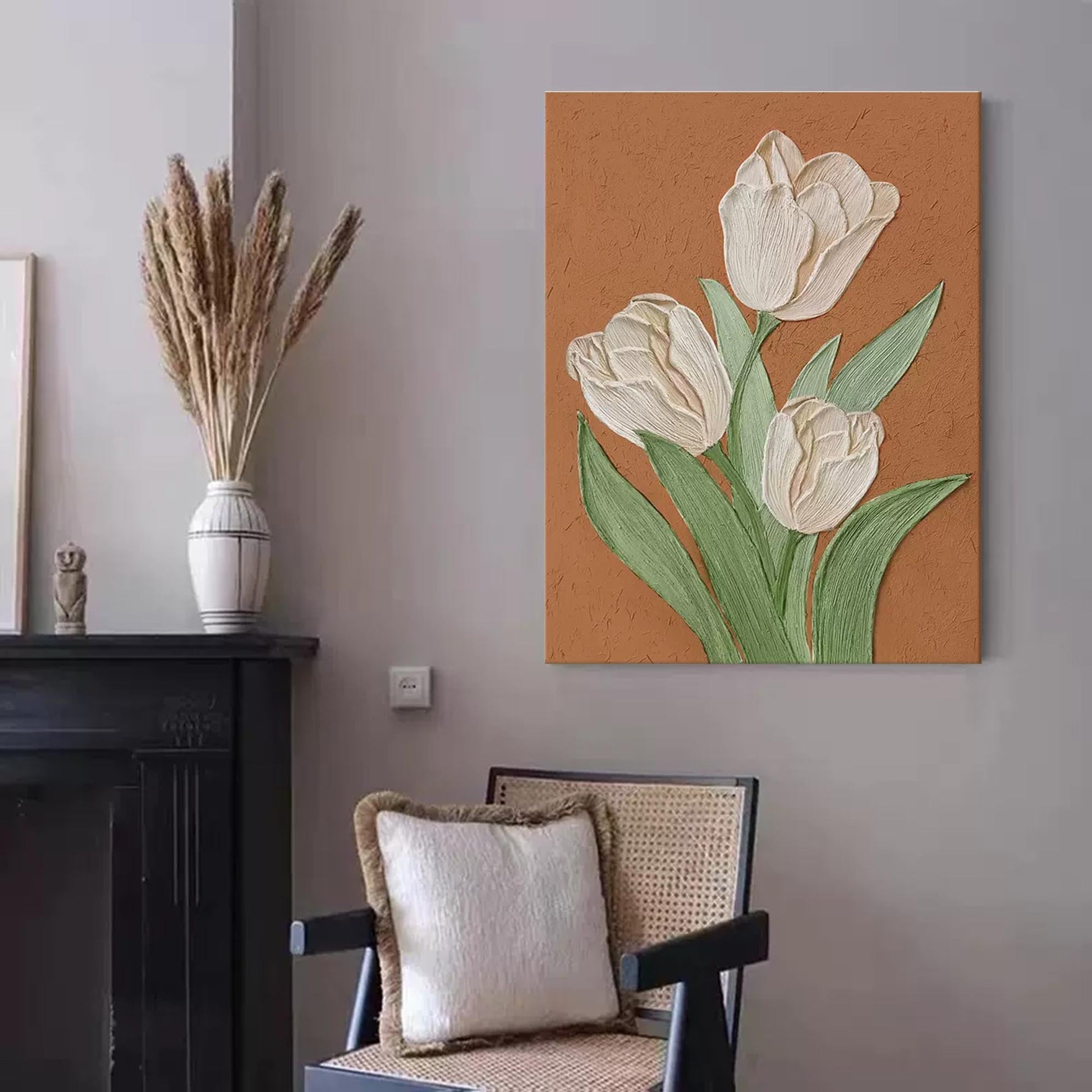 Bring earthy elegance into your home with this stunning tulip wall art. This piece showcases three white tulips in full bloom, each petal and leaf rendered with a heavy, sculptural texture that adds incredible depth. Set against a warm, plaster-like terracotta wall art background, this textured flower wall art creates a striking contrast. Its rustic yet sophisticated charm makes it a perfect piece of vintage floral wall art, adding a timeless, natural beauty to any living space or hallway.