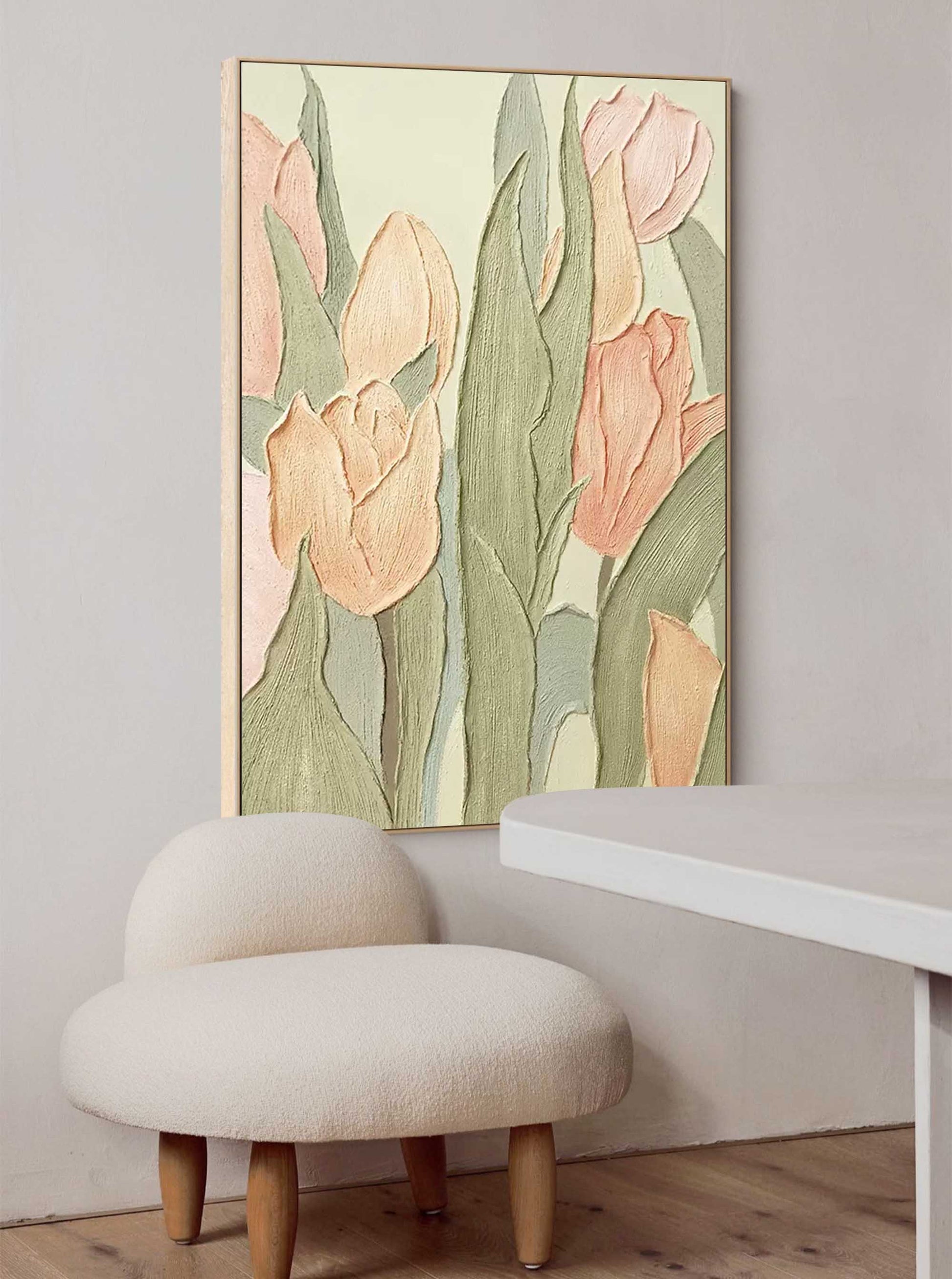 Welcome the feeling of a fresh spring morning with this enchanting tulip wall art. This piece is a beautiful example of vintage floral wall art, featuring heavily textured, sculptural tulips that rise from the canvas. The soft pastel palette of peach, dusty rose, and sage green creates a gentle and calming atmosphere, perfect for shabby chic wall art collections. Ideal for bringing a touch of nature's tranquility indoors, this lovely spring wall art adds timeless elegance and a peaceful ambiance to any room.
