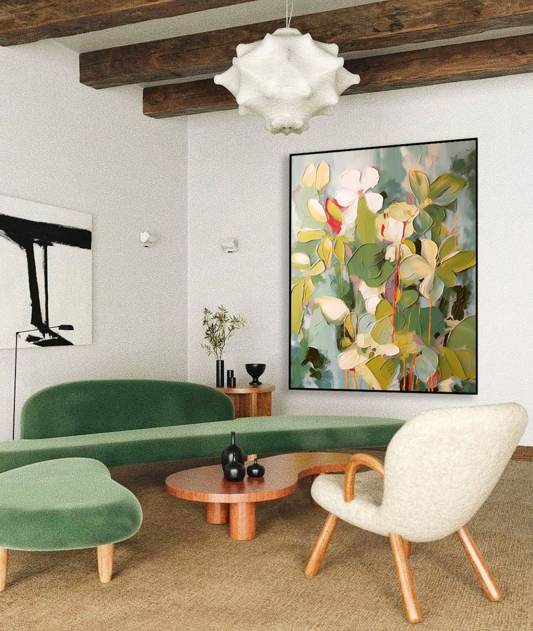 Experience the vibrant texture of a garden in full bloom with this exquisite floral oil painting. Created with a masterful impasto technique, this is a stunning example of a textured flower painting, where each petal and leaf is sculpted in thick, luscious oil paint. The composition features elegant white flowers set against a backdrop of rich greens, with pops of bright red. As one of our premier modern floral paintings, this piece of abstract art painting flowers brings a dynamic, three-dimensional energy and a touch of nature's elegance to any room.