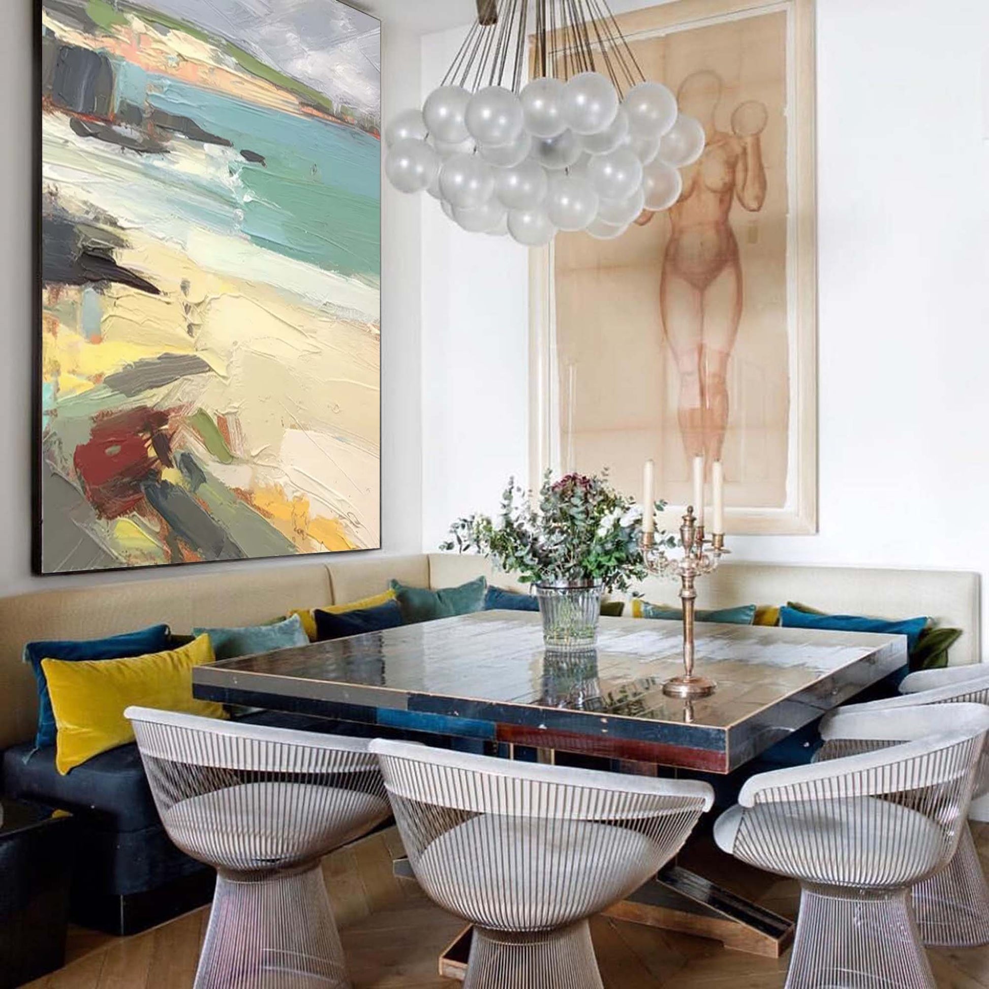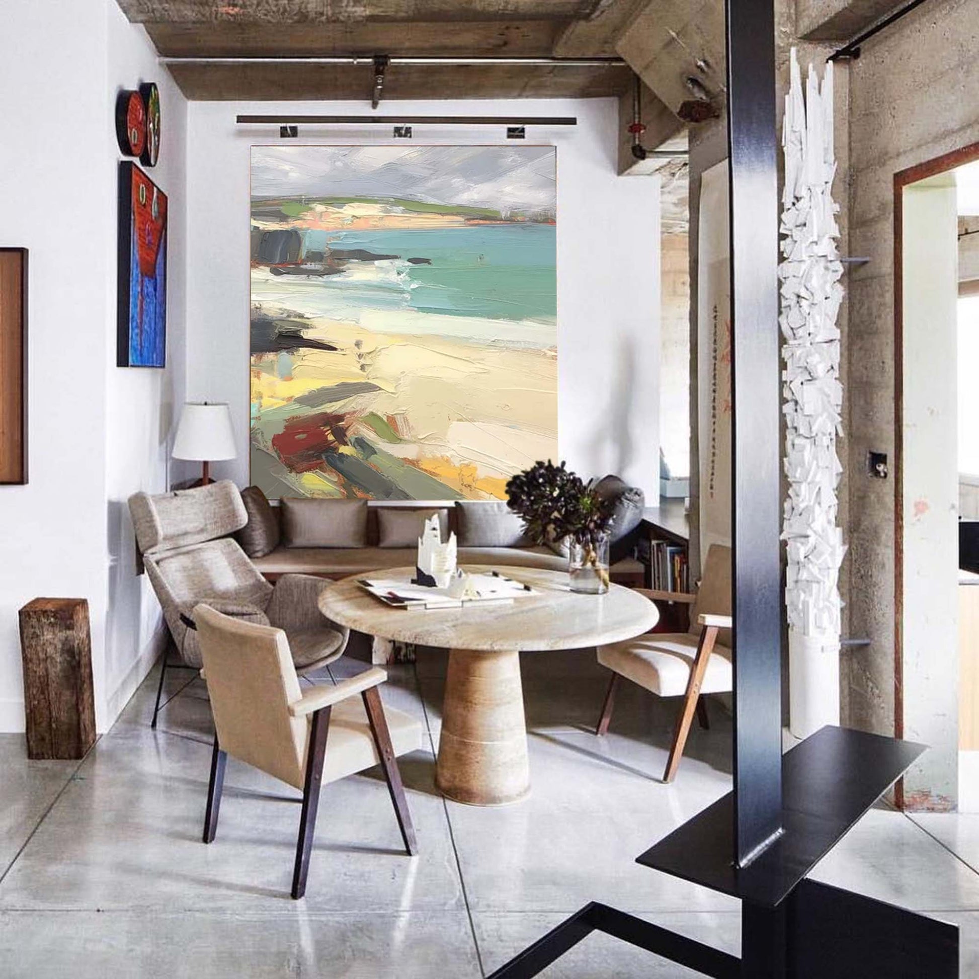 Bring the fresh, breezy energy of the coast into your home with this stunning seascape wall art. One of our finest coastal abstract paintings, this piece captures the shoreline with thick, expressive strokes of paint. This is a masterful beach painting oil on canvas, where the rich, tactile surface makes it a captivating example of textured ocean wall art. The palette of sandy beiges, turquoise water, and cloudy skies creates a serene yet dynamic atmosphere, perfect for any contemporary living space.