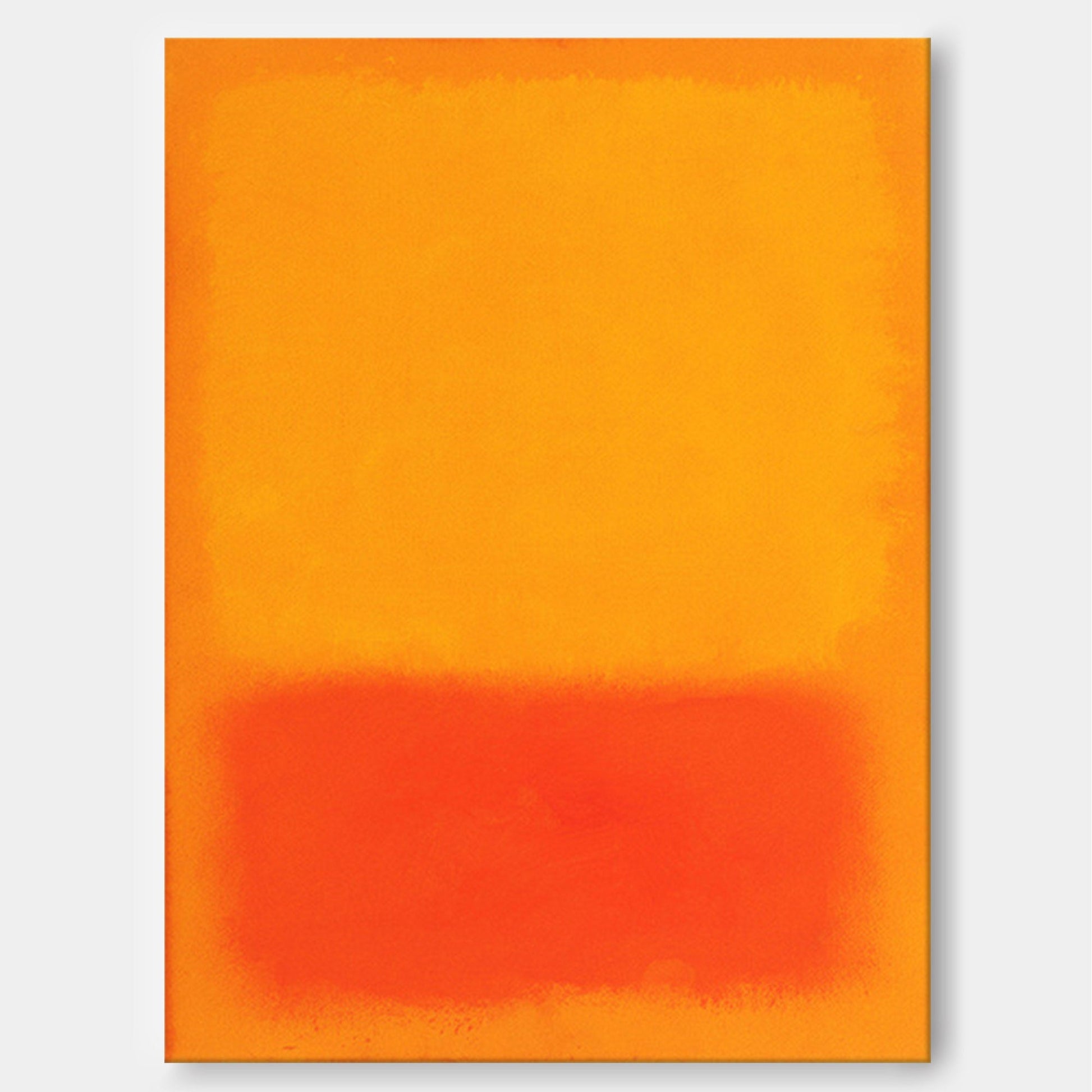 Immerse yourself in the radiant warmth of this captivating yellow abstract painting. Inspired by the masters of Color Field painting, this handmade artwork features a large, luminous field of deep yellow and orange layered over a vibrant block of intense red. The soft, feathery edges create a meditative and immersive viewing experience. As a powerful piece of minimalist wall art, its simple composition and bold color make a sophisticated statement. This modern abstract art is perfect for creating a contemplative and vibrant focal point in a contemporary living room or office.