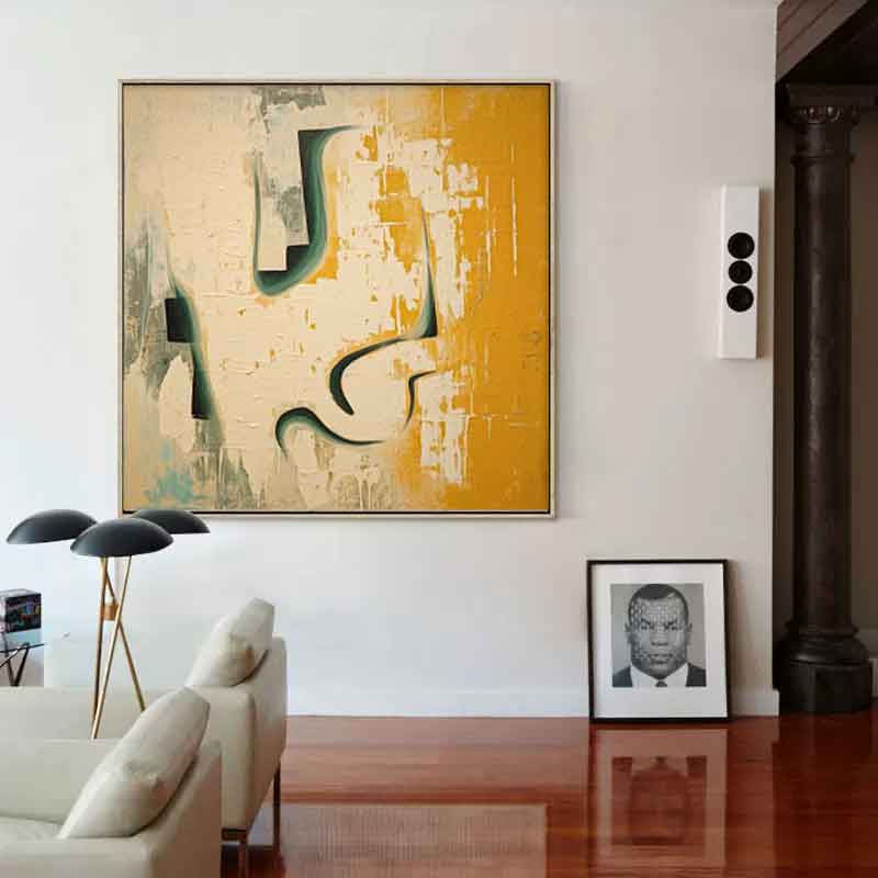 Make a bold statement with this stunning artwork yellow, a dynamic piece of modern minimal art. This hand-painted canvas features a powerful, calligraphic line flowing over a heavily textured background. As a premier example of rustic wall art decor, its rich ochre, off-white, and deep green palette feels both earthy and sophisticated. The raw, tactile surface makes this a captivating work of textured abstract art, perfect for adding a touch of bold, expressive energy to any contemporary interior.